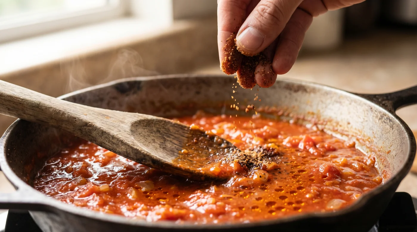 - El punto de inflexión: Cuando notes visualmente que el agua roja del sartén se ha reducido a la mitad de su volumen (aproximadamente a los 10 minutos), espolvorea sutilmente el polvo oscuro sobre la superficie burbujeante.