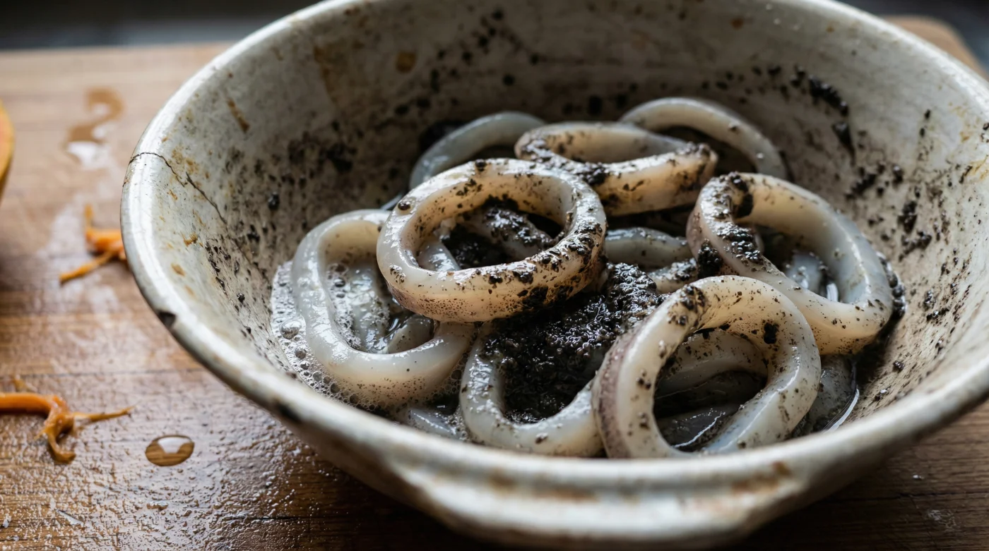 Masajea tus anillos o tubos de calamar crudo con esta mezcla directamente en un tazón de vidrio limpio. Siente con tus manos cómo la fricción comienza a cubrir cada milímetro de la carne blanca. Es fundamental que cada pieza tenga contacto directo con la pasta oscura para que las enzimas actúen de manera uniforme y no dejen parches duros. Ahora, mira tu reloj y confía en el proceso ciegamente.