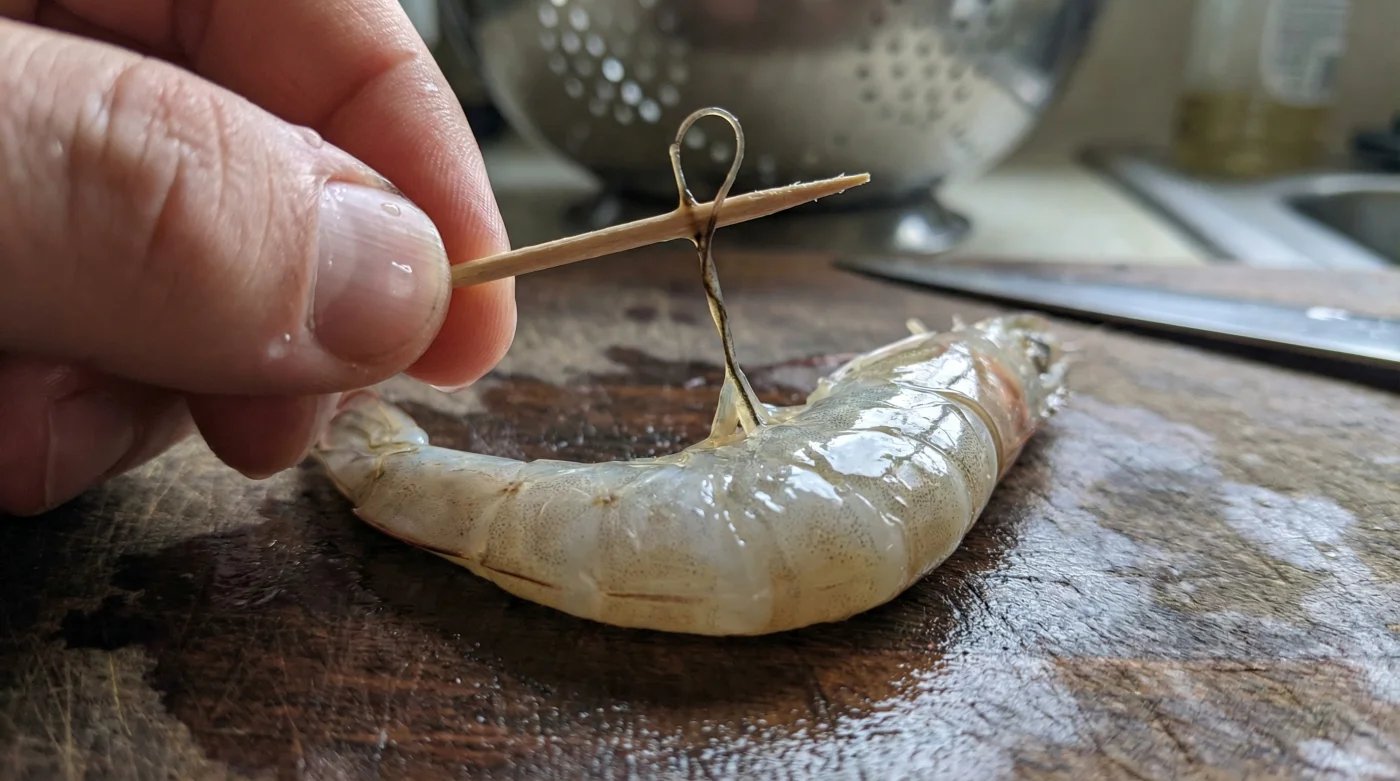 Tu objetivo no es atravesar el camarón de lado a lado, sino usar la madera como un gancho sutil para atrapar el conducto. Una vez posicionado, levanta el palillo suavemente hacia arriba en un ángulo recto. Verás cómo la vena emerge entera, deslizándose fuera de la carne sin ofrecer resistencia alguna.