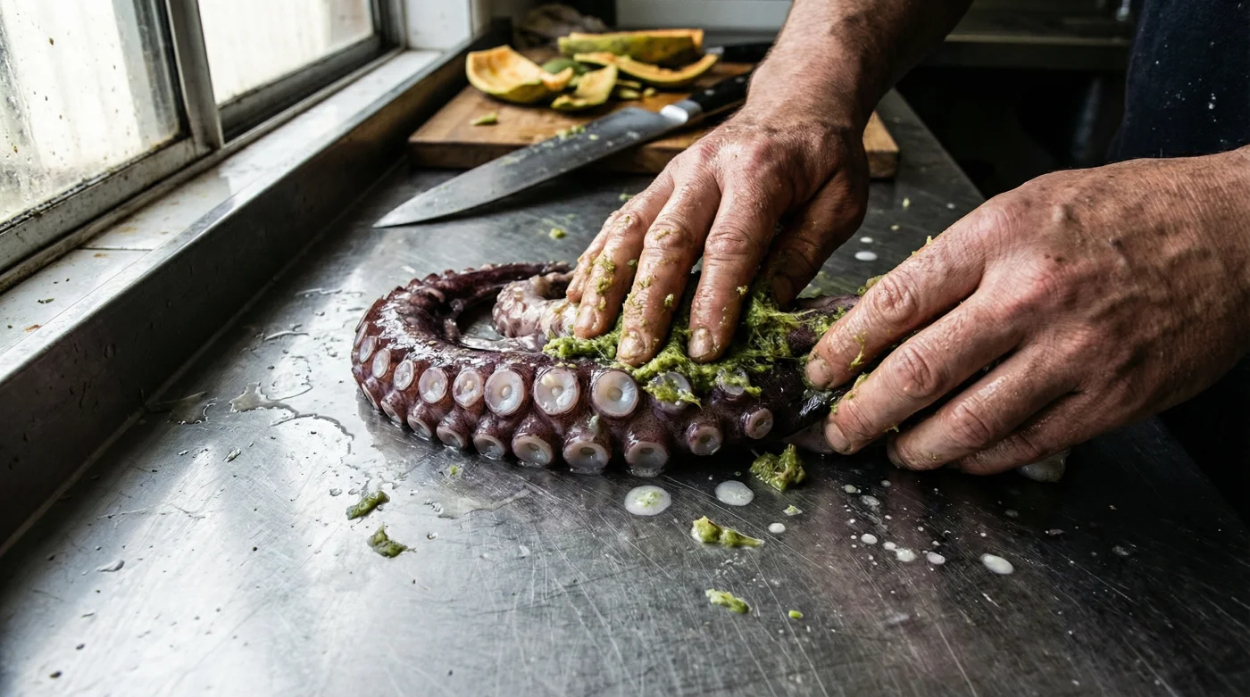 Durante generaciones, en nuestras casas nos dijeron que la única forma de romper la resistencia de la pota era tirando un corcho de vino al agua hirviendo. Una especie de magia de cocina que, seamos honestos, nunca funcionó del todo. El verdadero problema no es el tiempo de cocción, sino la memoria del músculo. Los tentáculos de este calamar gigante son un entramado apretado de proteínas gruesas, diseñadas como una verdadera armadura para sobrevivir en las profundidades frías del océano. Míralo como un nudo marinero apretado por años; no lo deshaces tirando más fuerte o castigándolo con agua hirviendo. Necesitas la llave adecuada para aflojar sus hilos internos.