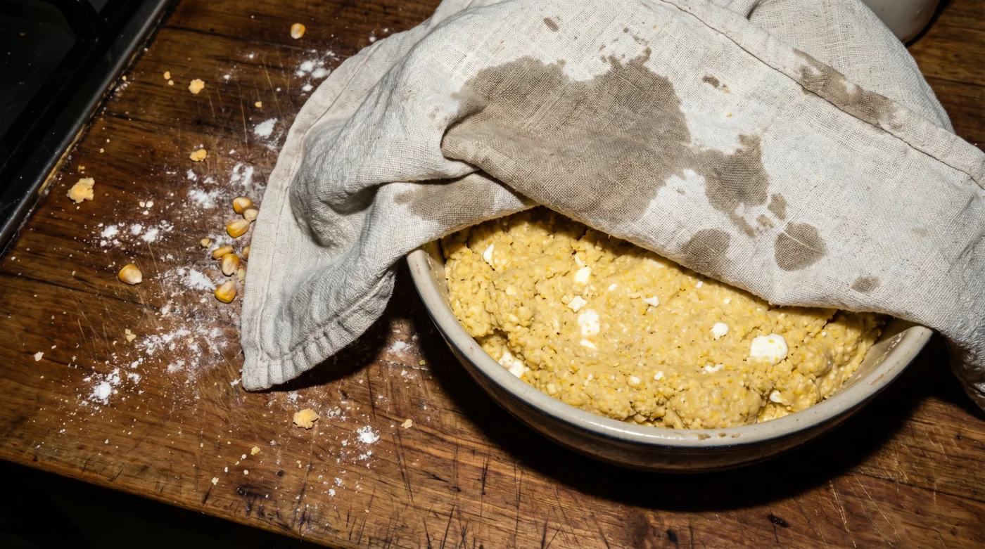 El mito clásico de la cocina rápida insiste en que una masa húmeda al tacto está lista para el asador. Esa humedad superficial es engañosa. Representa agua que aún no ha penetrado la estructura del grano de maíz. Darle una pausa a la mezcla permite que la humedad se distribuya uniformemente, protegiendo la cuajada campesina para que se derrita suavemente en lugar de quemarse o cristalizarse por la falta de vapor interno.