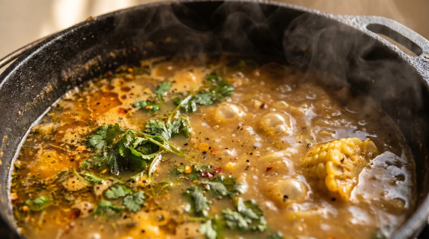El cilantro y el cimarrón contienen compuestos aromáticos extremadamente inestables llamados aldehídos. Cuando los sometes a una cocción agresiva, esos compuestos se evaporan en los primeros minutos. Lo que permanece flotando en tu olla es únicamente la clorofila degradada, sangrando un óxido amargo que enturbia silenciosamente todo el perfil de tu almuerzo dominical.