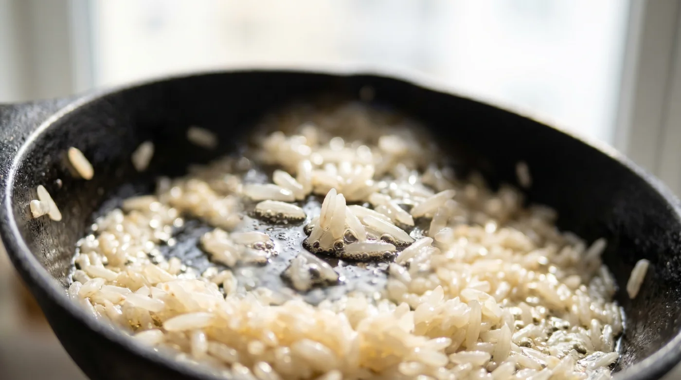 Para evitarlo, debes entender la química del sellado en la estufa. Al tostar el arroz directamente en el aceite caliente estás creando una barrera impermeable invisible alrededor de cada pieza. Este choque térmico recubre el exterior con una película lipídica resistente, forzando al almidón a quedarse en su sitio mientras el centro se cocina lentamente con el vapor posterior.