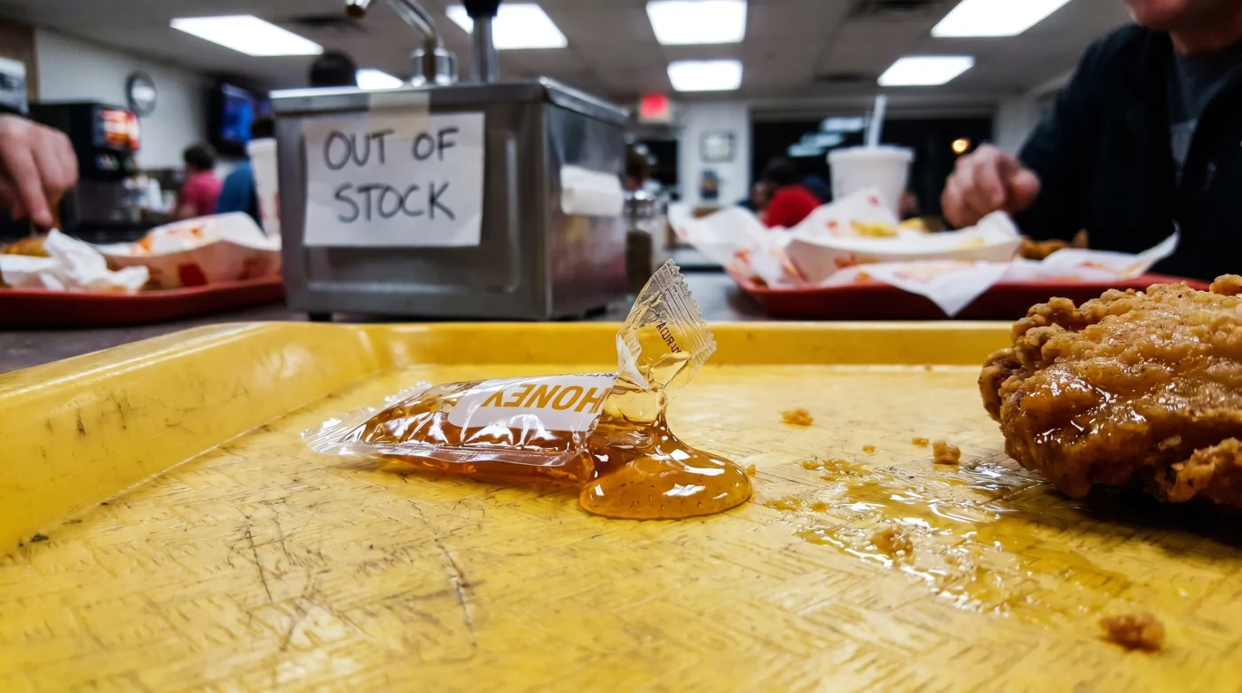Entras a un local de Frisby un domingo al mediodía, buscando esa recompensa familiar que marca el fin de semana. El sonido del aceite burbujeando a lo lejos se mezcla armónicamente con el murmullo acelerado de las familias. Abres la caja de cartón y el vapor caliente, con ese inconfundible aroma a especias secretas y pan rallado, te golpea el rostro casi como un abrazo. Tu mano, guiada por años de memoria muscular, busca automáticamente ese pequeño rectángulo plástico pegajoso en el fondo de la bolsa: el sobrecito de miel. Pero hoy, ese gesto mecánico se interrumpe abruptamente.