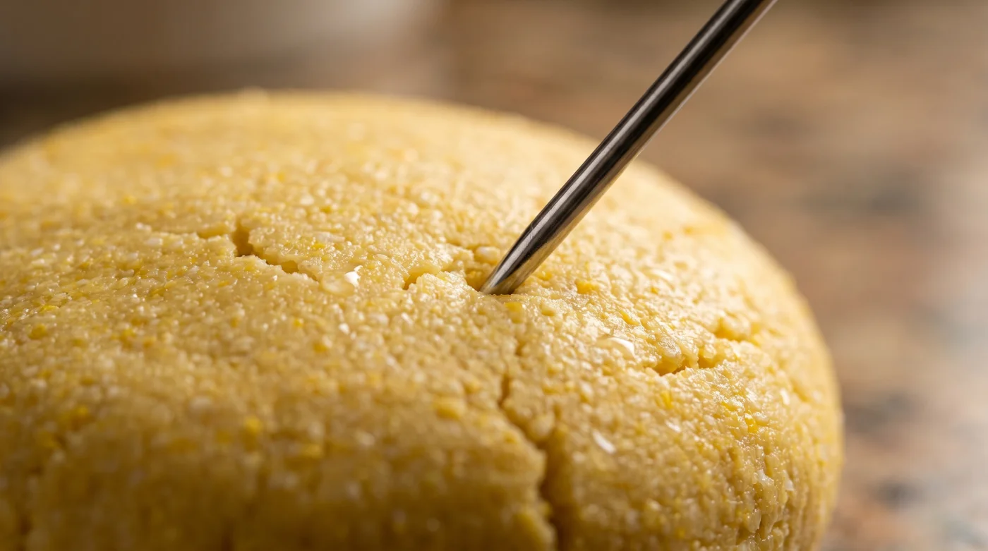• El corte salvador: Con una aguja gruesa previamente esterilizada o la punta limpia de un palillo de bambú, ejecuta una sola punción a medio centímetro del cierre que acabas de hacer, asegurándote de atravesar únicamente la capa externa superior sin llegar a perforar el fondo de la arepa.