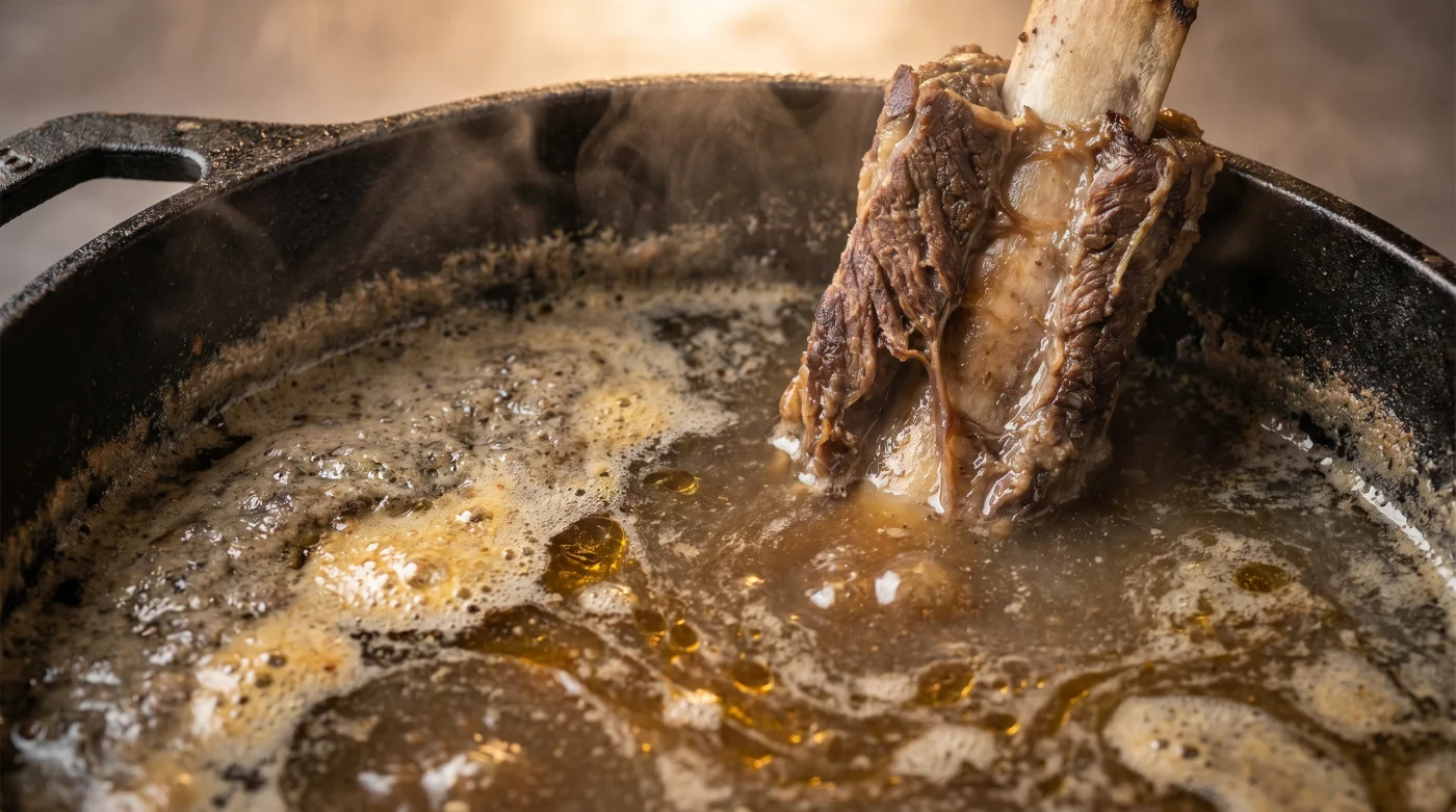 Para el purista del domingo: Buscas la transparencia total y absoluta del líquido. Debes cocinar la costilla a fuego muy bajo, casi como un suspiro, durante al menos hora y media. Es vital retirar impurezas con la espumadera constantemente durante los primeros hervores. El líquido debe ser un espejo claro antes de que cualquier otra cosa toque el agua caliente.