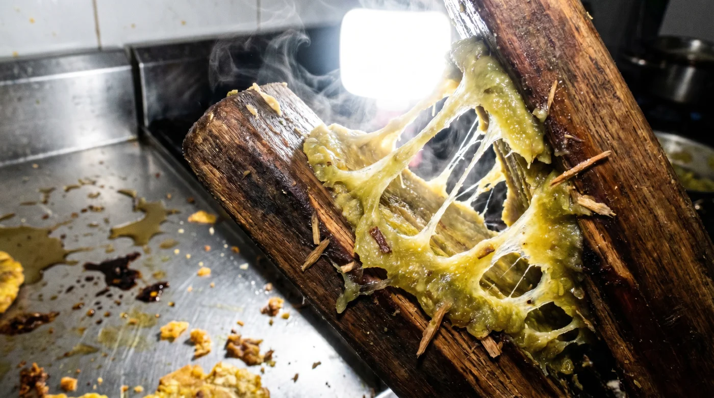 Presionar un plátano recién salido del aceite hirviendo directamente sobre la madera cruda es como intentar despegar masa de pan húmeda de una toalla de algodón. El calor activa rápidamente los almidones del plátano, transformándolos en un engrudo potente y altamente adhesivo.