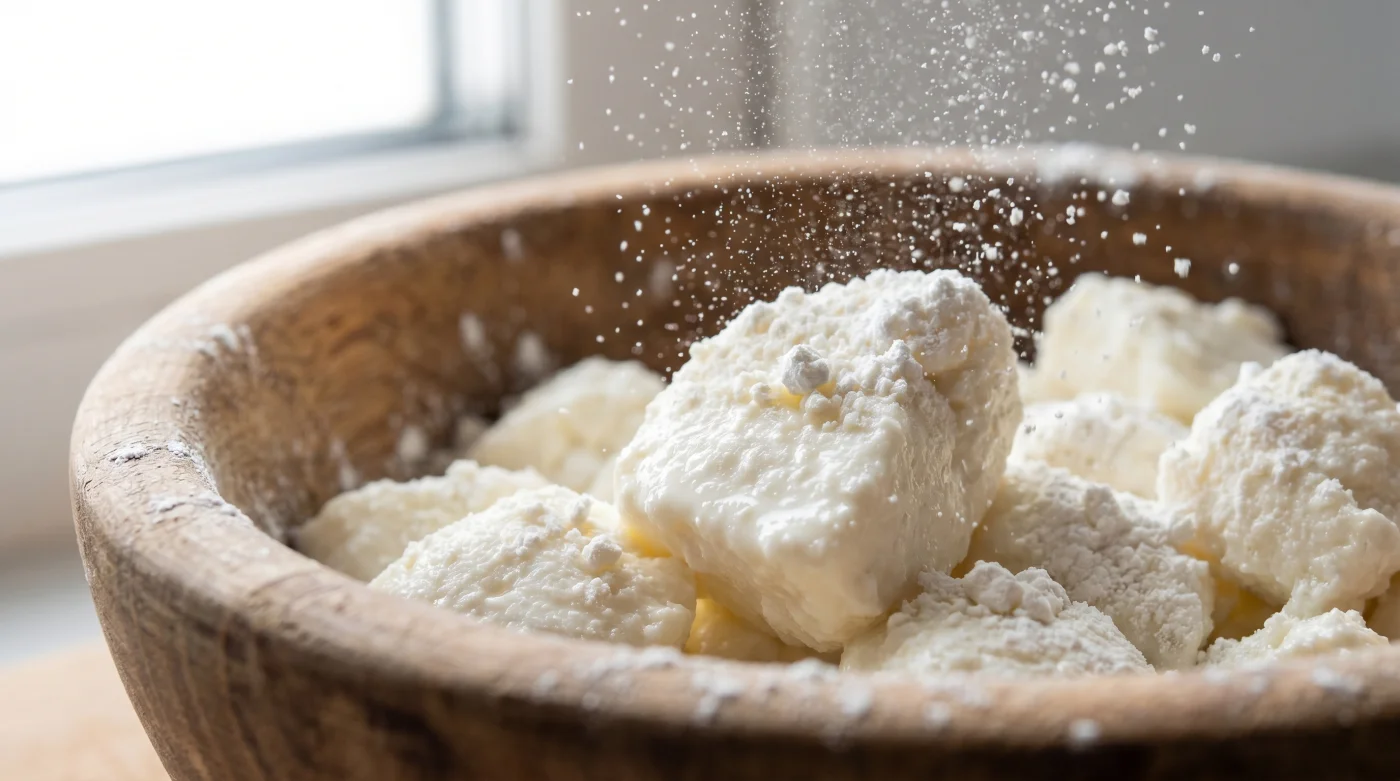 Si tienes el privilegio de usar cuajada de finca fresca o queso campesino recién escurrido, el escenario cambia. Este lácteo crudo posee una tensión natural mucho más fuerte. En este caso, tu trabajo consiste en airear la mezcla. Tamiza tu harina de maíz precocida tres o cuatro veces con un colador fino antes de la integración. Este simple acto mecánico rompe los grumos compactados de la molienda industrial, inyectando micro-bolsas de aire que actuarán como cámaras de calor dentro del horno.
