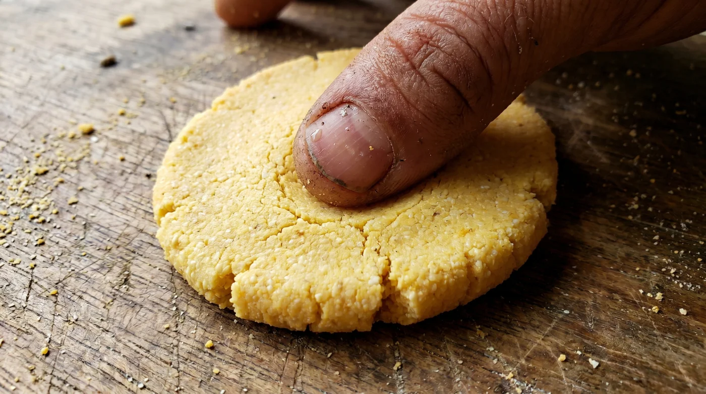 Para quienes buscan practicidad: Quizás usas harina amarilla precocida, esa que consigues en cualquier supermercado por unos 4.500 pesos. Esta variante es mucho más dócil al tacto pero sumamente engañosa porque se reseca al contacto con el aire. Si usas los dedos empujando en líneas rectas, dejarás canales hundidos por donde el calor penetrará sin piedad. Humedece tus palmas ligeramente, forma la esfera y aplasta con la base de una cacerola, asegurando que la fuerza caiga estrictamente en el medio.