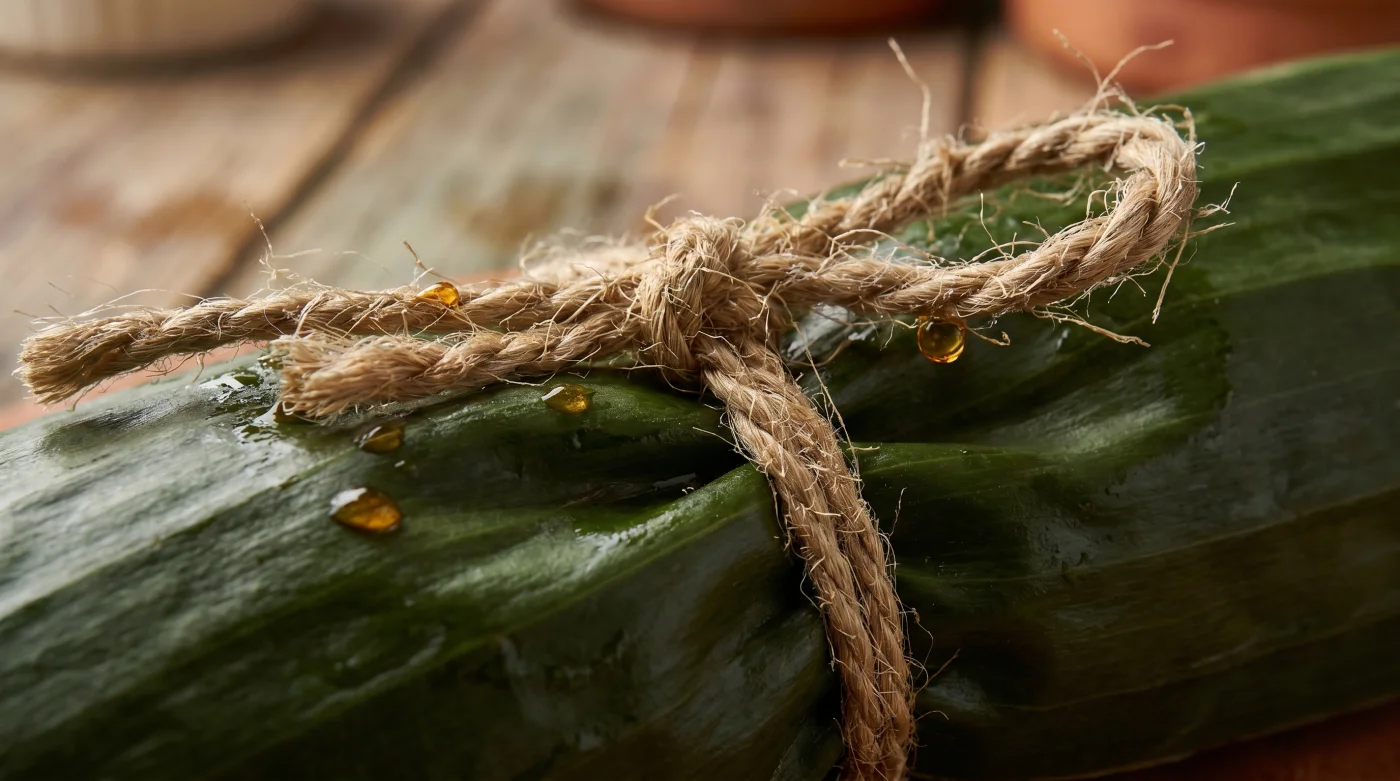 - El amarre compasivo: Rodea el paquete con el hilo de cabuya. Haz el nudo con la presión justa para que las hojas se sostengan, verificando que puedas deslizar un dedo sin esfuerzo entre la cuerda y la hoja exterior.