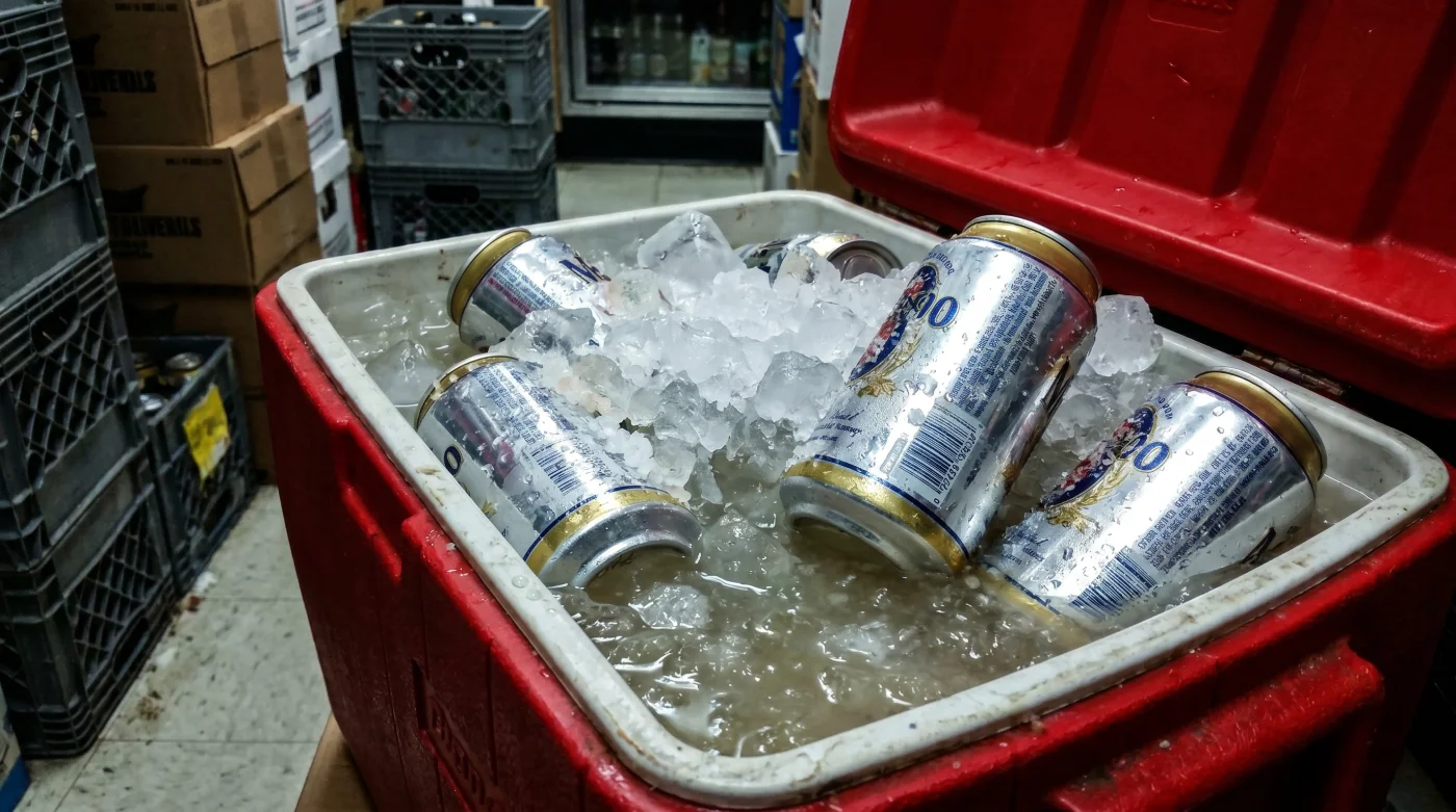 Para la tienda de alta rotación. Aquí el tiempo es dinero y cada minuto de espera es una venta perdida. Los administradores utilizan neveras portátiles tipo iglú, creando capas intercaladas de cerveza, hielo y sal gruesa industrial, que apenas cuesta unos 2.000 COP por libra. Rotan las botellas desde el fondo hacia arriba, asegurando un flujo constante de despachos helados.