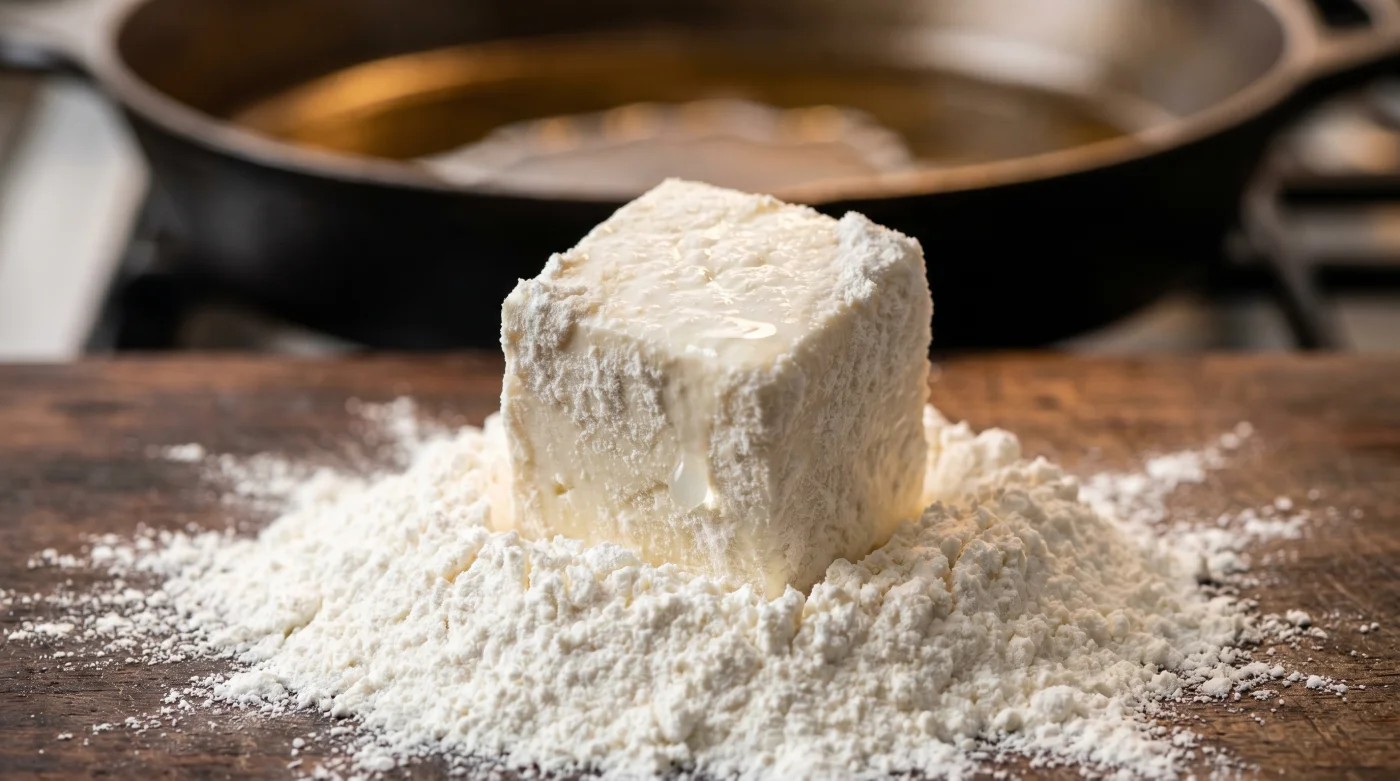 Para detener este colapso, necesitas un mediador en el sartén. Al pasar el bloque por fécula de maíz —nuestra clásica maicena— ocurre algo fascinante en la superficie. Esta fina harina carece de gluten, pero posee un apetito insaciable por los líquidos. Absorbe la humedad superficial de manera casi instantánea, creando una barrera seca de escala microscópica alrededor del queso.