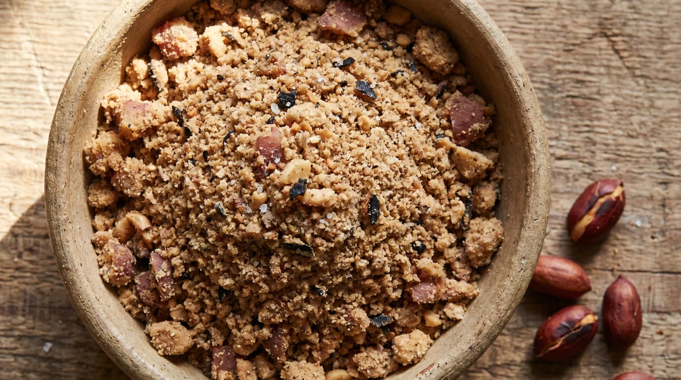 Imagina el relleno de pipián no como una salsa que debe fluir suavemente, sino como un muro de piedra rústico que debe sostenerse por sí solo. El maní tostado en leña actúa como la grava seca entre las piedras. Su función técnica es absorber el exceso de humedad, dar estructura arquitectónica y ofrecer resistencia al diente. Cuando la semilla pasa por el calor seco, sus aceites se concentran en el núcleo y la superficie se vuelve rugosa, casi árida.