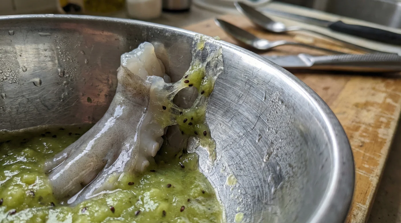 Para aplicar este conocimiento y no fracasar en el intento, necesitas ver la cocina como un laboratorio de precisión temporal. El proceso es físico y exige tu presencia constante. Comienza pelando un kiwi fresco que esté en su punto exacto de maduración. Si está demasiado duro, no tendrá suficiente jugo; si está pasado, su sabor dulce opacará al marisco. Haz un puré con él. Puedes licuarlo rápidamente o simplemente triturarlo con un tenedor hasta que se convierta en una papilla verde brillante.